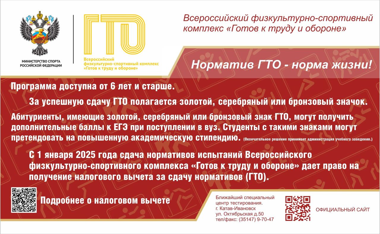 Уважаемые жители нашего района! Мы рады пригласить вас принять участие в сдаче норм Всероссийского физкультурно-спортивного комплекса «Готов к труду и обороне» (ГТО). Это уникальная возможность проверить свою физическую подготовку, укрепить здоровье и почувствовать себя частью большого спортивного движения нашей страны. Что такое ГТО?Комплекс ГТО направлен на развитие массового спорта среди населения разных возрастных групп. Участие в программе позволяет оценить уровень физической подготовки, мотивирует вести здоровый образ жизни и заниматься спортом регулярно. Для участия вам необходимо пройти тестирование по следующим видам испытаний: