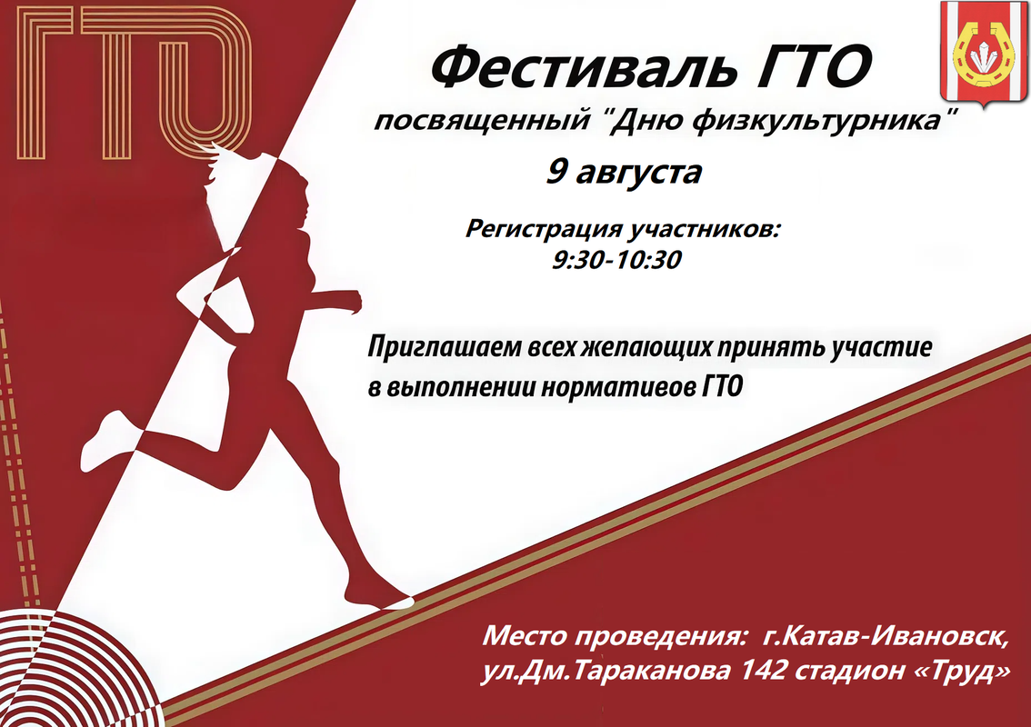 Напоминаем уже послезавтра 9 августа в Катав-Ивановске на стадионе «Труд» (ул. Дм.Тараканова 142) с 9:30 до 14:00 будет проводиться фестиваль ВФСК ГТО, посвящённый «Дню физкультурника».