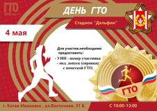 4 мая в Катав-Ивановске на стадионе «Дельфин» (ул. Восточная, 31Б) будет проводиться приём нормативов Всероссийского физкультурно-спортивного комплекса «Готов к труду и обороне» (ГТО) с 10:00—13:00.